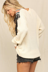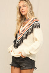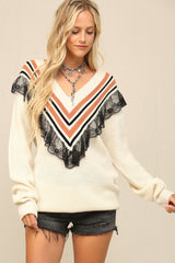 V-Neck Sweater W/ Stripe/Lace Trim Off White